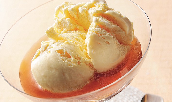 Thực hiện: Làm tan chảy rượu mơ Kokuto trên kem vani để có một món tráng miệng phong phú.