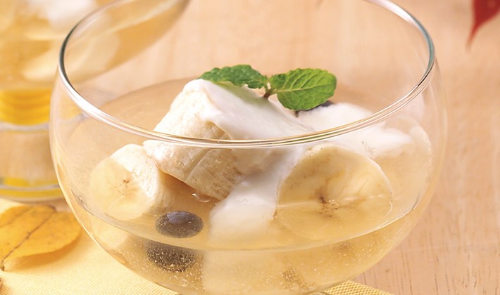 – Cắt chuối thành từng lát mỏng, cho vào bát, thêm sữa chua và việt quất vào, nhẹ nhàng đổ rượu mơ vào